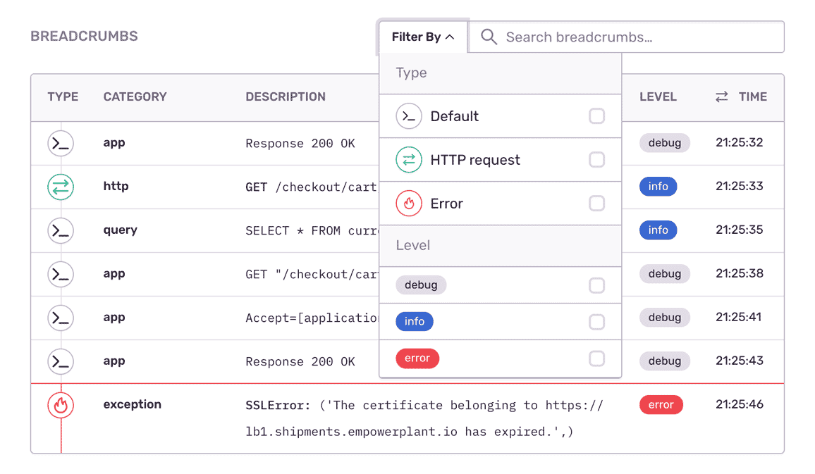 Aggregate errors by details like HTTP request, hostname, and app version to see what's new, a priority, or a trend.